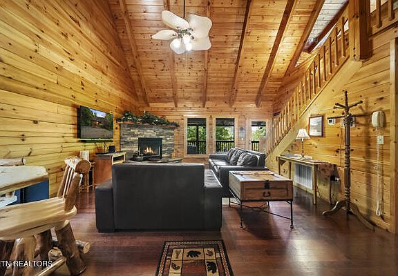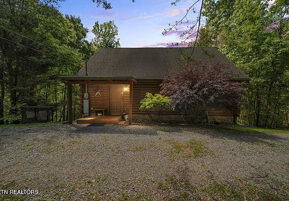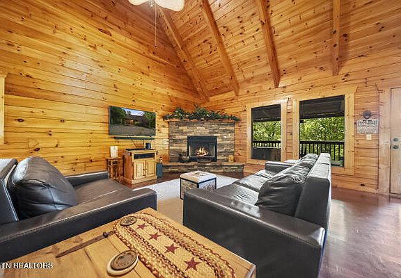 The perfect cozy cabin with a view! This lovely 1-bedroom, 1.5-bath cabin is just what you've been looking for. The open floorplan and high ceilings gives it a spacious feel. The stackstone gas fireplace adds to that cozy feel. The primary bedroom on the main has a relaxing heart shaped jetted tub, and a private access to the bathroom on the main floor. The large loft / 2nd bedroom overlooking the downstairs gives the perfect amount of privacy while still allowing you to interact with everyone on the main level. There is a half bath on the 2nd level too. The main level leads out to a covered deck that spans the full length of the cabin, and features a relaxing hot tub to enjoy. Making this one even better, there is a new HVAC, new lower deck, and the exterior of the cabin was just restained last year. This one has a strong rental history too. Being sold fully furnished and ready to be your perfect short-term rental, 2nd home, or permanent home. Located in a very peaceful area in Sevierville, yet only a short drive to Pigeon Forge, Gatlinburg, and all that you've come to enjoy in east Tennessee. *Drone photography used in photographs.