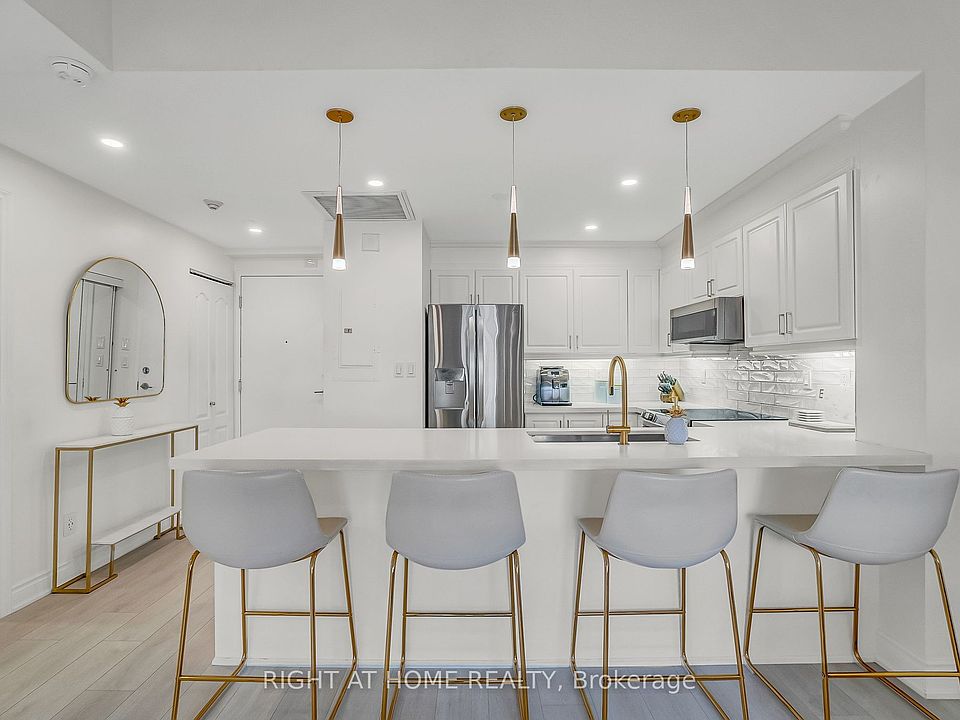 Welcome to Suite 205 in the Humber Lofts, a boutique collection of 33 units in the heart of Central Etobicoke only steps to all the amenities of Dundas St W, Bloor St W, street transit, Royal York Subway Station, Lambton Park and scenic walking trails along the Humber River! This condo has been tastefully renovated with contemporary finishings and is sure to impress. Upon entering the Suite, you're greeted with an open concept layout offering new laminate flooring, high profile baseboards and fresh neutral paint throughout. The kitchen is undoubtedly the focal point offering modern stainless steel appliances, plenty of hardwood cabinetry with gold accents, a chic bevelled subway tile backsplash, upgraded pendant & recessed lighting and quartz countertops with an extended peninsula offering plenty of bar stool seating. The living/dining room features soaring 10 ft ceilings and a Juliette balcony offering ample lighting into the Suite. The bathroom has been fully renovated with new porcelain tile, a modern vanity and a large shower complete with glass enclosure and gold accents. The primary bedroom includes a mirrored double closet, recessed lighting and a large window with California shutters. The roof top terrace was recently renovated featuring a peaceful sitting area, gazebo and barbeque area for you and your guests to enjoy. This home has been elegantly renovated and lovingly maintained by its current owner and awaits its next chapter with your family.