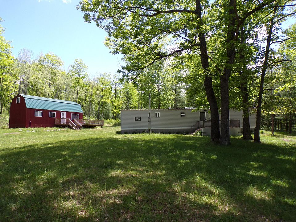 Amish built Barn style home with loft bedroom and 3/4 bath. Knotty pine interior thru out with Cathedral ceilings. Large wrap around deck looking at mature Maple forest. Well kept remodeled two bedroom, one bath mobile home with replaced windows and metal roof for your overflow guess space. Twenty one beautiful acres bordering Federal Forrest to the East and South side of property.