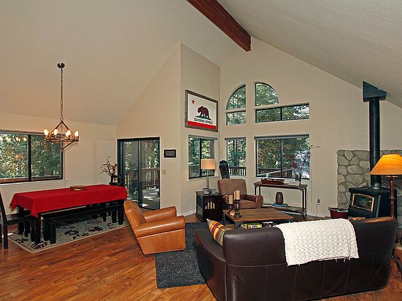 Great value in Shaver Lake's Sierra Cedars neighborhood. Comfortable well maintained updated mountain house with large windows, high ceilings and a kitchen which opens to the dining and living room leading to a wonderful deck nestled amongst the trees. Cozy free standing wood stove plus central heating warmth for snowy winter nights. Master bath/bed and laundry are on main floor, 2 guest bedrooms upstairs, full bath and loft on upper level. Paved driveway enables year around easy access to the oversized finished garage. Extra parking on the large lot, there is even an RV hookup. Tankless hot water too! Perfect for year around living or a weekend getaway.Owner says the cleared piles of snow makes for a fun sled run in wintertime! They will remember how they have loved the little community; the hiking, sledding, nature and meeting the nicest people!