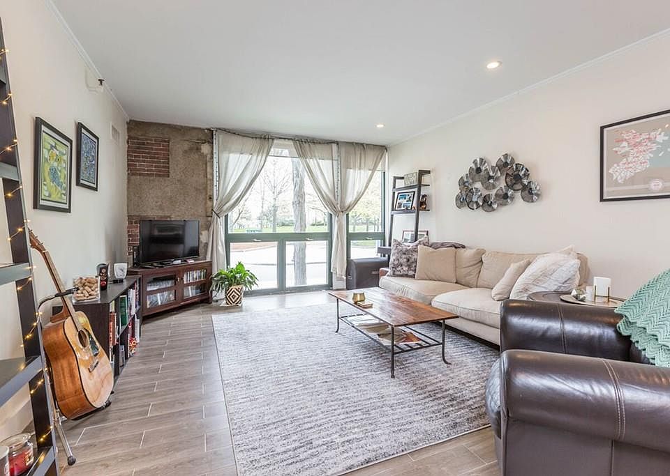 Floor to ceiling windows with park view! This spacious and charming one bedroom has updated kitchen with granite and stainless including gas cooking, dry bar off the living room perfect for entertaining, "wooden" concrete floors which are both stylish and durable. Full tiled bath with tub, generous closet space, central AC. Exposed brick adds charm! The full service building features: Club Room, Conference Center, Billiards Room, State of the Art Gym, Outdoor Heated Pool, BBQ Area, Concierge and access to the waterfront. The location cannot be beat! On the Partners Shuttle, playground across the street, cafes and bistros nearby, walkable to the new brewery and and jaunt to just about anywhere you want to be. One valet parking space included. Pet friendly! Best priced unit in the association! Compare the others and you'll know this is a deal!