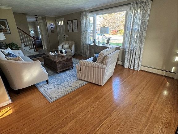 Picture perfect vinyl sided colonial with 4 bedrooms 2 1/2 baths all updated and lives like new. New stamped concrete walkway to inviting foyer open to living room and dining room with gleaming hardwood floors, new high end kitchen with granite counter tops and stainless steel appliances. Cozy family room with sliding glass door to patio and large open yard. Huge primary suite with walk in closet and bathroom, updated main bath with newer fixtures and ceramic surround…bonus features include large three seasons room with wall to wall glass and forced air heater in garage. Newer mechanics; vinyl replacement windows, high efficiency boiler, forced air unit was installed in attic for AC. Located near schools, expressways and restaurants.