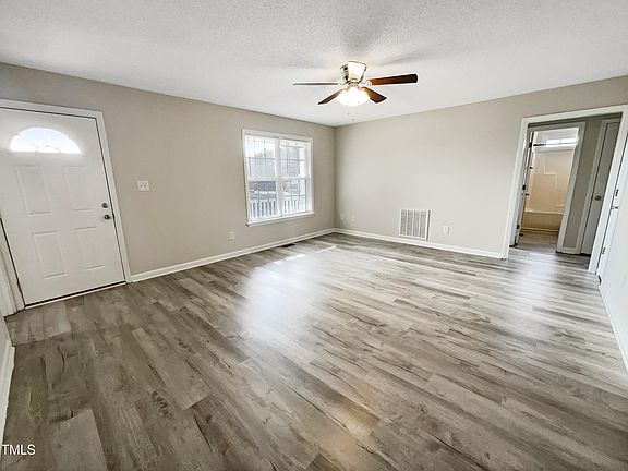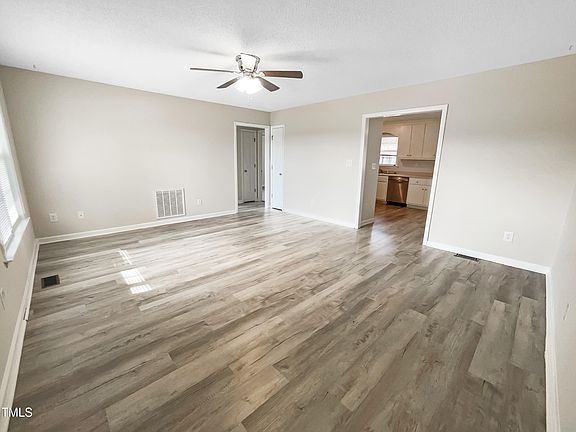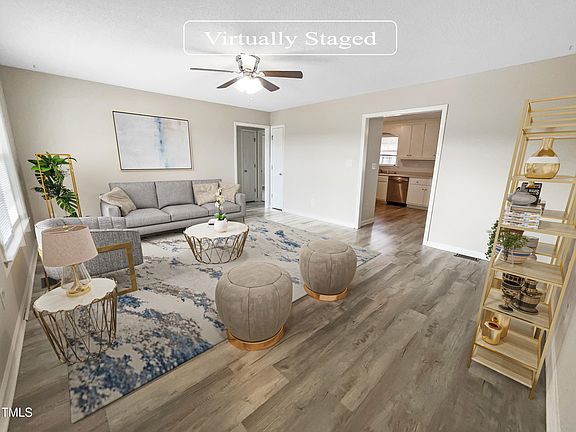 Updated Ranch home conveniently located near I-40, shopping, dining & schools! Spacious family room offers a brushed nickel ceiling fan w/a light & luxury vinyl plank hardwood style flooring that continues thru to the kitchen, dining, hallway & full bath. Just beyond the family room is the bright kitchen/dining area w/white cabinets, brushed nickel pulls, crown trim, a window over double basin stainless steel sink, recessed niche for a refrigerator, pantry, brushed nickel overhead light & stainless steel appliances. A 3/4 glass door leads to the covered rear porch w/stained deck floor. The spacious primary bedroom has a ceiling fan & plush carpeting. The adjoining primary bathroom offers a dual vanity & separate shower room. The walk-in closet has wood shelving. Other features include 6-panel interior doors w/brushed nickel door hardware & neutral wall color. Outdoor features fenced in back yard w/patio & putting green.