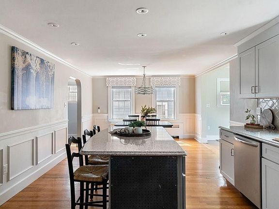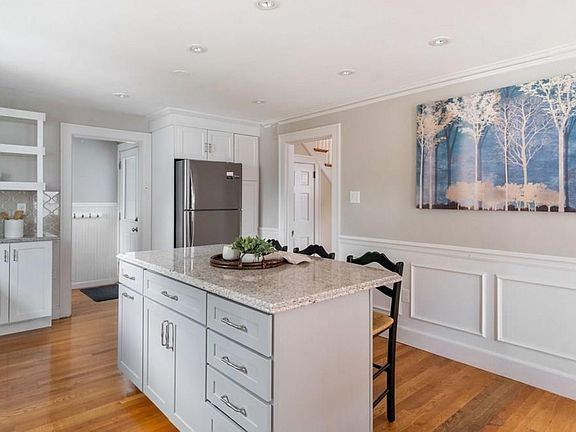 - Kit Dscrp: Dining Area, Flooring - Hardwood, Countertops - Stone/Granite/Solid, Kitchen Island, Stainless Steel Appliances, Recessed Lighting, Remodeled, Exterior Access, Gas Stove, Decorative Molding
