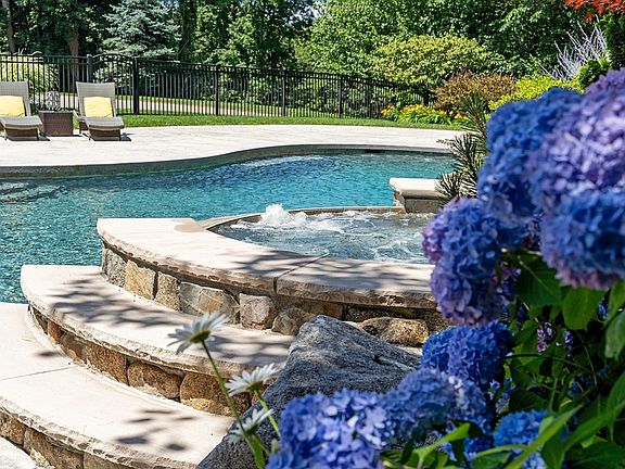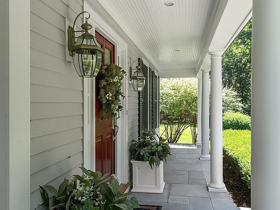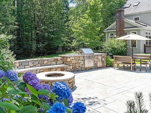 A winding drive leads to this beautifully sited home! Meticulously built & maintained on 4 private level acres w/easy access to walking trails, enjoy the utmost in gracious living. Granite pavers lead to columned front porch, setting the casually elegant tone to 4 levels of solid construction and fine workmanship. Bright & spacious the foyer is flanked by fireplaced living room & elegant dining room. Custom kitchen w/high-end apps, center island, back stairs to 2nd floor and slider access to fabulous deck overlooking the backyard oasis makes outdoor entertaining easy. Dramatic family room w/columns, high ceiling & skylights, a quiet office, half bath & mudroom off 3-car garage complete 1st level. Upstairs finds sumptuous 3-room primary suite, 3 add’l ensuite family BRs& laundry. Versatile 3rd level offers BR5 w/ensuite ideal for aupair/in-law + a finished LL. Backyard bliss w/heated salt water pool, slide, waterfalls, hot tub spa, deck w/seating, built-in grill & more, move right in!