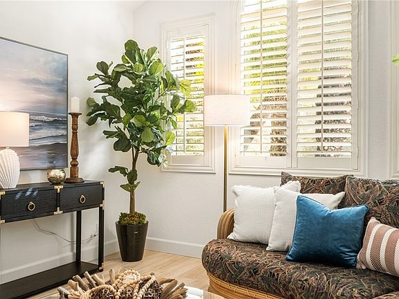 Nestled on a serene, single-loaded street, this private, single-story home offers breathtaking ocean, harbor, and Catalina Island views. The light-filled interior is wonderful for entertaining. It boasts elegant wood-like tile flooring throughout most of the home, creating a seamless flow. The gourmet kitchen is equipped with sleek stainless steel appliances including stainless double ovens, ideal for any chef. The spacious family room features a cozy fireplace, speakers and access to the outdoors, perfect for both relaxation and entertainment. New windows were just installed throughout the home. Most rooms are adorned with custom wood shutters, while air conditioning ensures year-round comfort. Step outside to a beautiful covered patio where you can enjoy the amazing views. Your outdoor gatherings will be a hit in this great outdoor space complete with lighting.