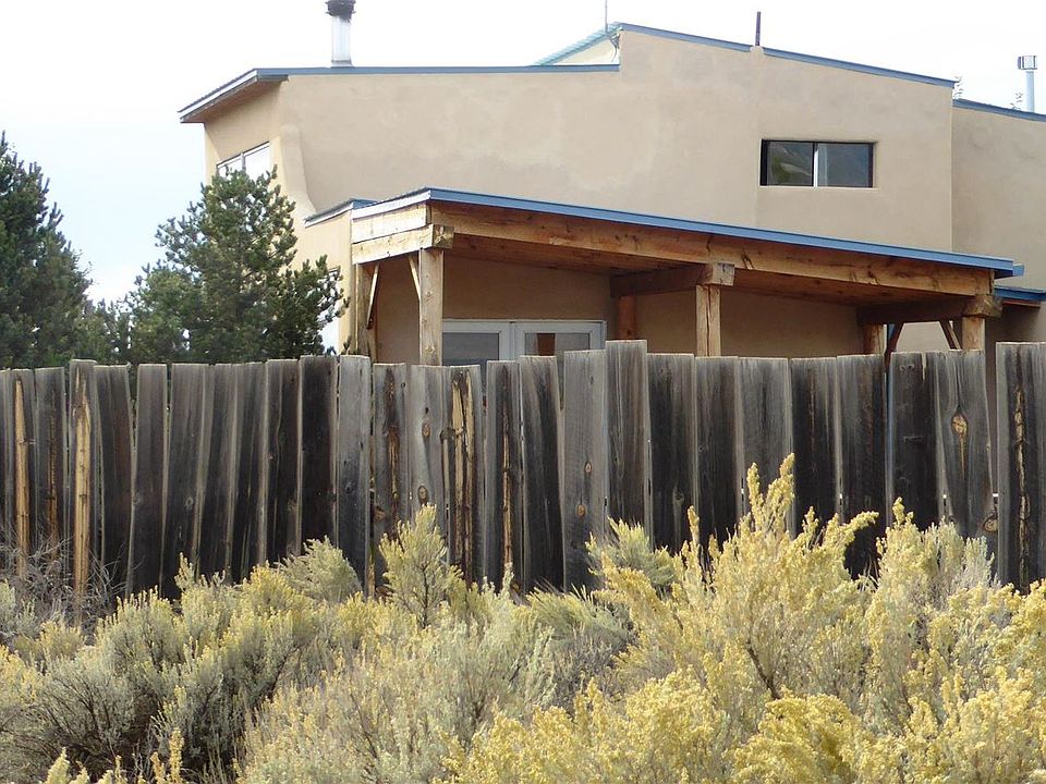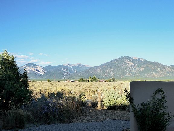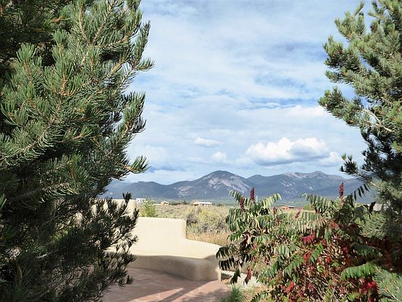 VIEWS! VIEWS! VIEWS! in every direction... from inside the house and the detached studio... and from the spacious portal and flagstone patio facing Taos Mountain. More wonderful outside spaces include flower gardens, a variety of trees, and fenced yards. Heavily laden apple and plum trees add to the ambiance. Big windows let in lots of light, and provide warmth in the winter. There's plenty of storage. Great northside location between the Town of Taos and Taos Ski Valley. Make this charming Taos home your own!!