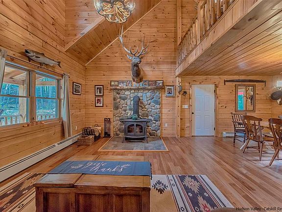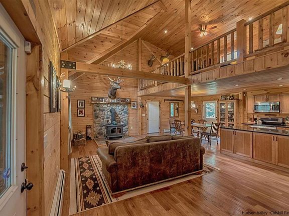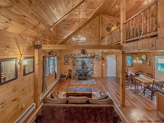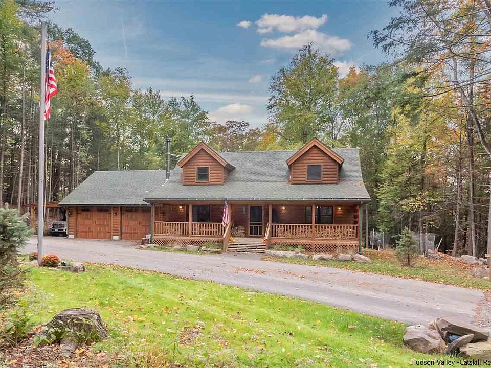 Come to the country and enjoy this beautiful Log Home. Situated on 2.9 acres on a quiet country road in Hurley, yet convenient to surrounding Stone Ridge, High Falls, and Kingston and easy access to commuter routes 209 and the Thruway! Relax on the cozy front porch, or sit on the back porch and enjoy nature! There's an above-ground pool, plus an out door shower and hot tub that can't be missed! Beamed ceilings grace this open area into the dining area and kitchen along with the den above. First floor bedroom is a bonus as well. Automatic on generator for those winter storms. Amazing wood stove will keep you cozy on these chilly nights. Plus a spacious 2 car garage for all the boys toys!