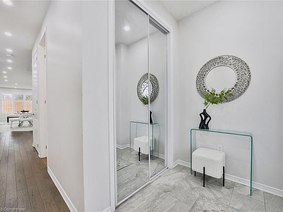 Welcome to this exquisite, fully detached home built in 2019, featuring a double door entry and soaring 9-foot ceilings on the main floor with a total floor area of approx. 2700 SqFt and an upper level separate laundry room, This home is surely to impress. This perfect home offers a spacious and inviting living room and dining area, complemented by an upgraded eat-in kitchen equipped with stainless steel appliances and an elegant oak staircase. The upper level is home to four generously sized bedrooms, including a primary bedroom with a modern 4-piece ensuite and an expansive walk-in closet. Additionally, the second floor features three more bedrooms with large windows and access to a covered balcony, another 3-piece bathroom, a substantial linen closet. All windows and door coverings have been upgraded to premium California shutters, and the home is enhanced with pot-lights both inside and out. Conveniently located less than 5 minutes from the Waterloo airport and the Breslau Community Centre, this home combines style with functionality. The Tarion Warranty, providing added security and peace of mind, will be transferred to the new owner.
