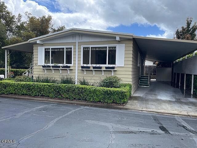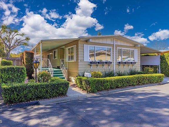 Located in one of Ojai's premier senior parks, this home is located on the perimeter of the park so there is little passing traffic and the corner lot offers more privacy. This home has been updated with handsome laminate flooring throughout, as well as dual glazed vinyl windows. The front windows features shades that operate from both the bottom and the top so you can maintain your privacy and enjoy the elegant mountain views. The open kitchen features newer appliances, quartz counter tops and plenty of counter space any cook would appreciate. A pantry as well as plenty of cupboards, complete this spacious kitchen plus the washer, dryer and refrigerator are included at no extra charge. The dining room has a built-in hutch that provides extra storage and and an opportunity to showcase your treasures. The home interior is clean and freshly painted in warm neutral colors, just bring your color palate to make it yours. Copper wiring and water heater are another bonus for peace of mind. Extra long covered porch accommodates entertaining on warm summer evenings. Just steps from the home you can access the private back gate of the park so you can walk the Ojai Trail and take advantage of a variety of restaurants, a pharmacy and public transportation. Well appointed park amenities include pool, spa, club house with cozy fireplace, game room and gym. Classes and social gatherings are offered should you choose to participate. Simplify your life in this affordable senior community.