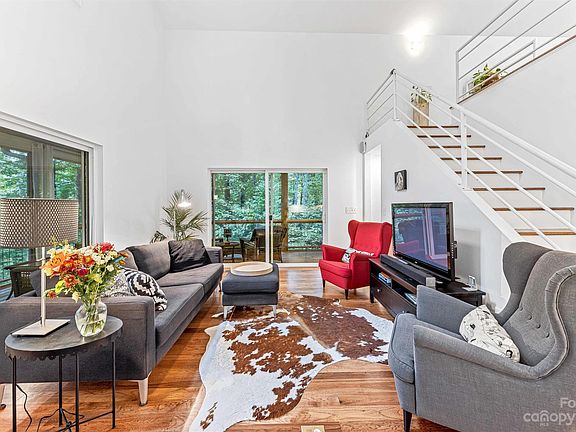 Tucked in the mountainside of Black Mountain, is a beautiful and modern mountain retreat. Resting on 6.4 acres, this Brent Campbell designed home boasts mountain views, privacy and land to roam. The interior has a modern light and airy feel with vaulted ceilings, kitchen showcasing Sapele Wood countertops & custom cabinets, primary bedroom with large walk-in closet on main, & spacious loft/2nd bedroom & half bath upstairs. The unfinished basement has 9-foot ceilings that could easily be finished for more square footage. An outdoor enthusiast’s dream, this property provides beauty inside and out with a wraparound screened porch, hot tub with mountain views, outdoor shower, beautiful outhouse next to camp area & fire pit, plus a chicken coop. House is surrounded by roughly 2.5 acres of electric fence. The perfect combination of being close to downtown Black Mountain and Asheville amenities but also away from it all. Makes a perfect primary residence, vacation home, or short term rental!