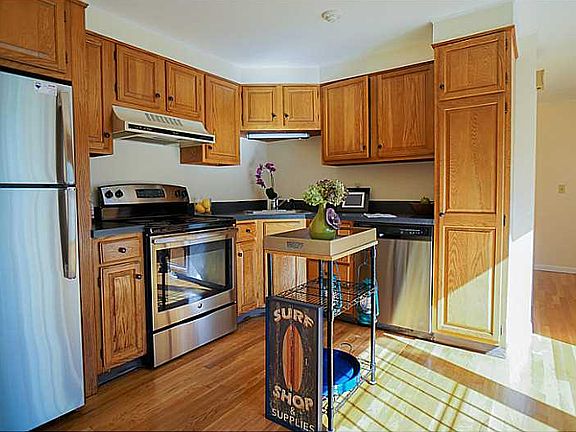 Priced to sell! Lovely back end unit facing field. Private entrance, deck, garage, in unit laundry, crown moldings, new shingles, sliders, stainless appliances, refinished hardwoods, fireplace, attic & basement. Sunny SE exposure.