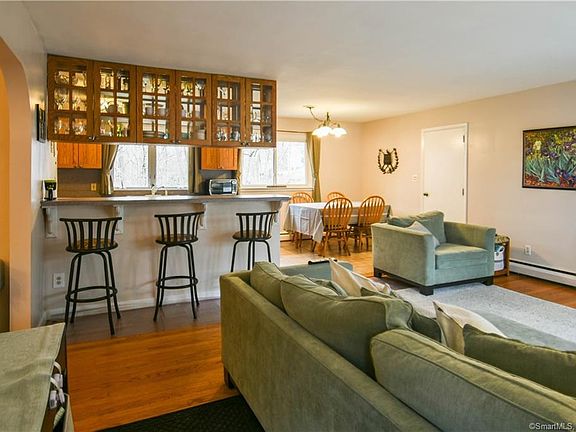 Move right into open floor plan home, set on a quiet dead end street surrounded by woods. This Ranch is beautifully decorated. Lots of natural light, Hardwood Floors and Ceramic Tile throughout, updated kitchen with breakfast bar opening to Living Room and Dining area, Den-Playroom that has door to back yard, slider to front yard and open stair case to the lower level. Partially finished walk out lower level with family room/3rd bedroom/office, 1/2 bath, laundry area and great storage. Private level back yard with large patio perfect for barbecues. Convenient to shopping and highways. Updated Bathrooms, New Boiler. Super location.