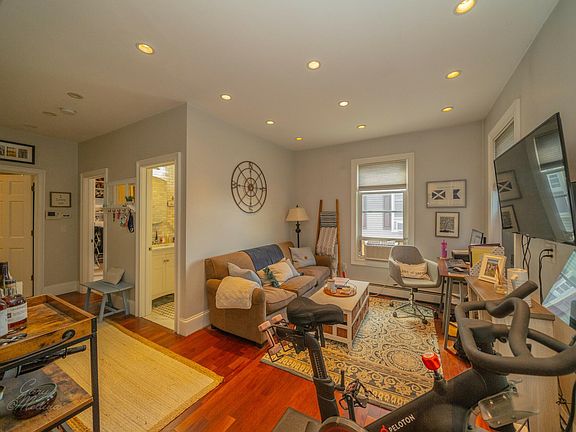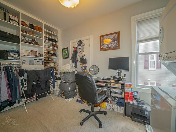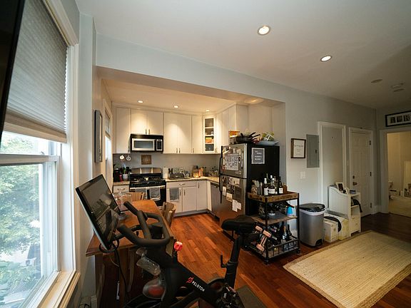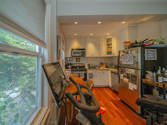 No last month deposit. Small dog OK. This is a nicely renovated 2nd floor 1.5 bedroom. The unit features washer and dryer in second room with wall unit for clothing storage. Modern granite and stainless kitchen and renovated bathroom. The second room can have a bed but better suited as closet/office space. This is a very unique unit.