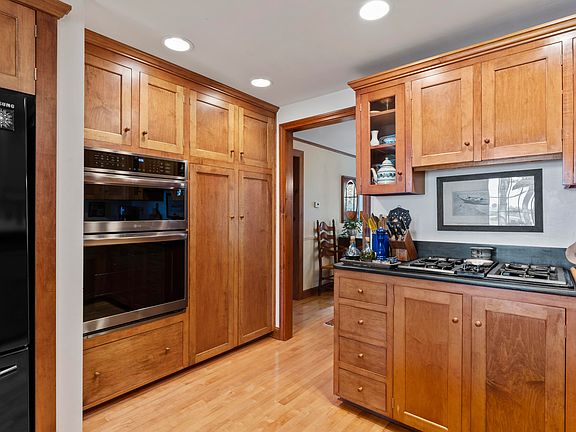 Inside, a stunning fireplace anchors the main living space, while the generous kitchen impresses with slate countertops, double ovens, and a gas cooktop — ideal for home chefs and entertaining alike. The attached two-car garage provides convenience and storage.