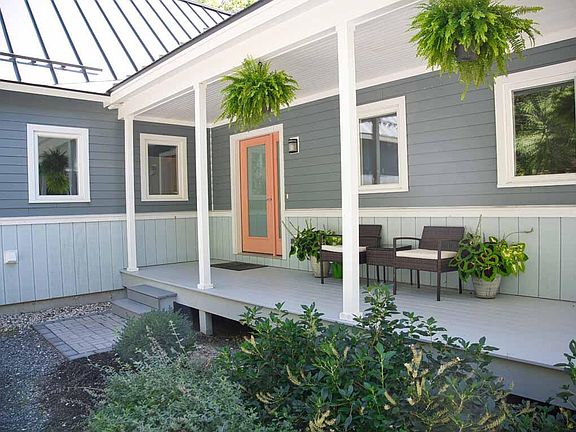 If you are looking for a truly comfortable green home that is incredibly energy efficient with minuscule energy costs, look no further. 42 Intervale is located in the highly coveted, green Kelsey Brook subdivision. Featured on BrightBuilt's website as their Foxbird Ranch model, this 1900+ sqft single-story home has an attached two-car garage over an acre of forested land. It comes with triple-pane windows, ZipSystem air-tight build, metal roof, and well-insulated walls. The house has three bedrooms and two full baths, one of them en suite with the primary bedroom and its spacious walk-in closet. There is a great room with a soaring cathedral ceiling, and plenty of light from walls of windows looking out into a flowering meadow and forest backdrop. The kitchen is fully equipped with two Whirlpool wall ovens, a deluxe Bosch induction cooktop, a french door Whirlpool fridge, an under cabinet-mounted GE microwave, and a Whirlpool dishwasher. The attached pantry increases the more than ample cabinet space in the kitchen and the quartz counter-topped island makes the entire kitchen an entertaining cook's dream. Whirlpool washer, dryer and a Filtrol discharge microfiber filtering system protects the environment and greatly increase the effectiveness of the septic field. 26 south-facing solar panels generate more electricity than the house uses in most months, with an avg. bill of $52/month. One Daikin heat pump and two attached mini-splits heat the house – one in the great room and one in the primary bedroom. Individually controlled electric baseboards in both baths and the two spare bedrooms provide additional heat when those rooms are use. 2 tanks provide propane to the Generac 16 kW emergency generator, backyard firepit, patio grille, and the sealed fireplace insert in the living rm. The basement is unfinished, but fully insulated, clean, and bright. With environmally-friendly features throughout, 42 Intervale is truly designed to be a Net Zero home. Ask about closing