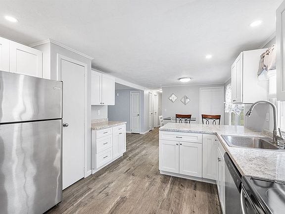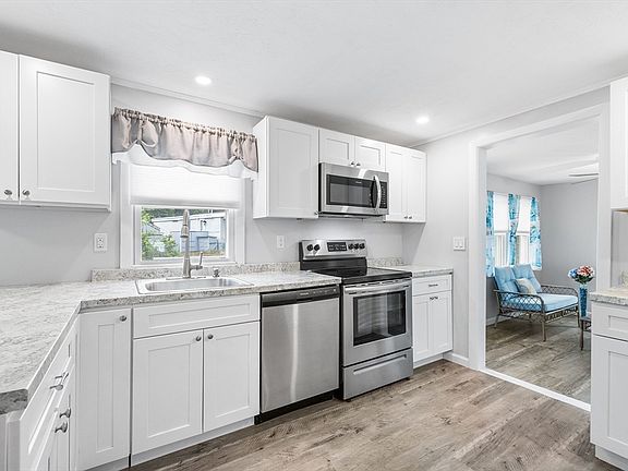 This stunningly renovated double wide in Cranberry Village (55+) offers modern comfort and low-maintenance living. Enjoy a spacious open floor plan, two bedrooms, two full baths, and a cozy heated bonus room. Recent updates include a new roof, electrical system, hot water heater, new flooring, and a bright eat-in kitchen boasting a breakfast bar and newer appliances. A charming bay window adds character. The primary suite features a custom walk-in closet and private bath. Central air, a carport, a back deck, and a storage shed complete this delightful home. The community clubhouse with fitness center, library, and social activities is included in the monthly park fee($530). Fully furnished (w/ new TV and patio furniture) and move-in ready, this home is perfect for those seeking a carefree lifestyle.