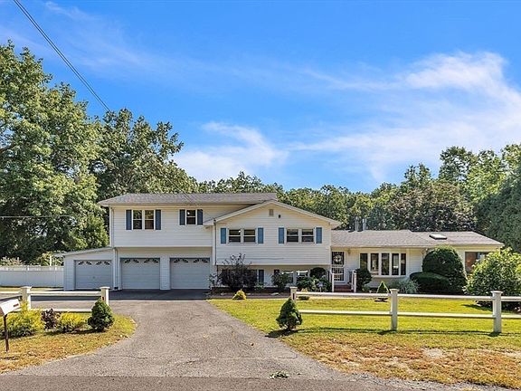 Motivated Seller offers a new improved price on this move in ready split-level on nearly 2 acres boasts fresh painted rooms, new carpet, and flexible floorplan. The Great room features vaulted ceilings, abundant natural light, wood floors opening to conversation area w/ gas fireplace, newer bay window. Dining area and 3-season porch just off the kitchen. Upstairs, unwind in the luxurious primary suite, complete with a Palladian window, huge walk-in closet, and private balcony. The two additional bedrooms include a second suite with three closets, private deck, and opens to bonus room. Lower-level family room features, bar area, laundry, ½ bath, and enviable walk in storage rooms. Step outside to your oasis: a sparkling pool with a newer liner, pump & filter – pool house w/ custom bar - tennis courts - sprinklers - fenced yard! Multiple garages 2/1 bays provide extra space for cars, equipment, boats etc. You will enjoy this quiet country location, and only 5 minutes to I-91.