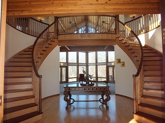 Luxurious Lindal built home. Open your door and be stunned by the grandiose foyer that allows the perfect view through to the majestic living room that is completely open to the second floor with windows that abound from the floor to the ceiling, stone fireplace and built in entertainment center. The formal dining room is adorned with a built in buffet with shelving and hardwood floors. The extensive kitchen is endowed with granite counter tops, island with cook top and breakfast bar, extensive cabinets with built in desk, double wall ovens and a huge eating area which allows access to the deck or the massive sun room. 1/2 bath just off kitchen. Also on the 1st floor is your impeccable home office with built in shelving and a fireplace; a bedroom and full bath. The second floor is graced with an extensive master bedroom with sitting area, fireplace and en suite that is beyond imaginative. Second bedroom with en suite and secret room behind bookshelf. Laundry also on this level.