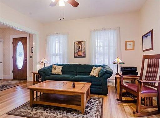 Adorable 4-bedroom Belmont Hill single family on a quiet street, with inviting front, wrap around porch. Follow foyer to fireplace living room with lovely mantelpiece, to traditional box/bay windowed dining room, featuring built-in, wainscoting with chair rail. Foyer, LR and DR all have hardwood floors. Older eat-in kitchen, with gas range, and pantry area. Second floor features three good sized bedrooms, fourth, smaller bedroom could be an office or nursery and full bath. Recent updates include new gutters, new chimney, front and back walks, front steps and new automatic opening garage doors, new fuel storage tank. Corner lot to private way leads to detached garage (2 garage spaces and 2 outdoor spaces), yard, and children's private way for street ball.