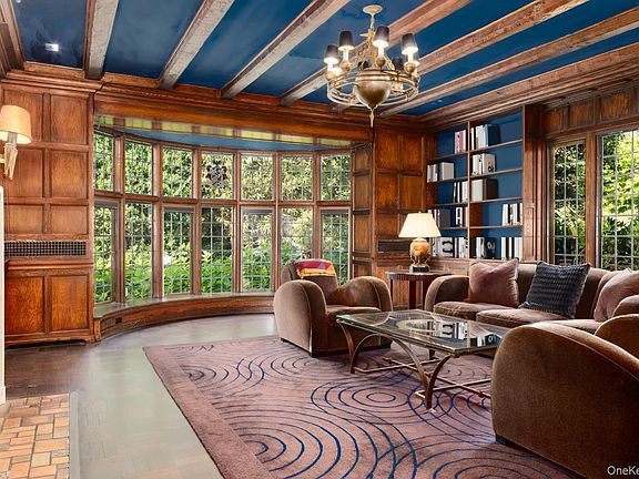 Just twenty minutes north of Manhattan yet a world apart, 42 Masterton is ideally situated in the prestigious Masterton Woods Estate section of Bronxville Village. Perfectly located within walking distance to the school, train, and village, this much-admired 1927 French Normandy Tudor was designed by acclaimed architect George H. Pohle. The home’s signature features include a striking turret, restored oak beams, elegant woodwork, soaring ceilings, and original leaded glass windows. Following a complete renovation, the residence now blends historic architectural charm with modern upgrades, offering timeless beauty and contemporary comfort. Upon entering, the rich craftsmanship, attention to detail, and striking color palette—chocolate browns, claret reds, and inky blues—set an elegant tone throughout.