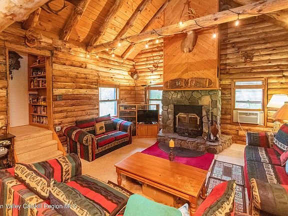 Mountain Top Retreat! Escape to this charming log home, nestled at the end of a private road, surrounded by serene woods that offer ultimate privacy and tranquility. The large rocking chair front porch invites you to relax and soak in the peaceful setting with view of spring fed pond. Step into this cozy log cabin, where the main level features an open living room with cathedral ceilings and exposed log beams, highlighted by a stunning stone fireplace. The country kitchen, open to the dining and living areas, is both functional and inviting. A full bath and a comfortable bedroom complete the first floor. The second level includes a bedroom and a loft overlooking the living room, showcasing hardwood floors and vaulted ceilings with more exposed beams. The full walk-out basement with high ceilings offers great potential for additional living space. Enjoy summer nights in the cozy screened-in porch, perfect for sleeping or relaxing. This property is sold with an adjoining 2-acre parcel on a separate deed, including a large detached garage ideal for a workshop or studio, seasonal mountain views. With a total of 3 acres, you have the flexibility to build another home or sell the parcel separately, offering endless possibilities for country living!