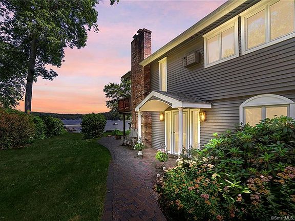 Beautiful Views from this Contemporary Year-Round Lakehouse 108' of Water Frontage on Lake Pocotopaug Enjoy Motor boats (gas allowed, water skiing, Kayaking, Sailing, Fishing and more Tons of space between the 3100+ SF Home and the 6-Car Garage w/ Loft. The Main House has 3/4 Bedrooms and 2.5 Baths. The Garage Loft includes a Full Floor to use as poss. BR, Full Bath and a Deck. The Garage has Propane Heat on on one side. Property has a Full Circular Driveway, Breathtaking Landscaping and Paver Walkways The Kitchen has plenty of storage, 2 Ovens, 2 Skylights and a Breakfast Bar There is a Sunroom (w/ skylights and Deck off of it to Enjoy. The Living Room Faces the Lake and has an Abundance of Light that Shines Through w/ 2 Sliders and Sklylights as well as a Gas Fireplace. The Main Floor Family Room has a Gorgeous Fieldstone Gas Fireplace and 2 Sliders to a Patio looking out to the Lake. The Main Level has 3 Bedrooms and an oversized Laundry Room. There is a Storage Shed on the Property as well. The Home is Wired for a Generator. Portable Dock is Included. No Flood Insurance Required. Windows of Home were previously Treated with Energy Reflective Coating. House is being Sold AS-IS.