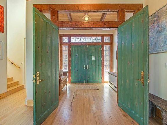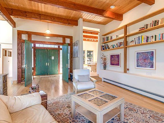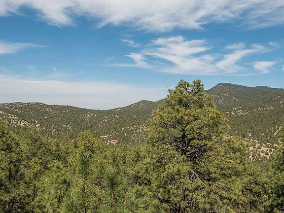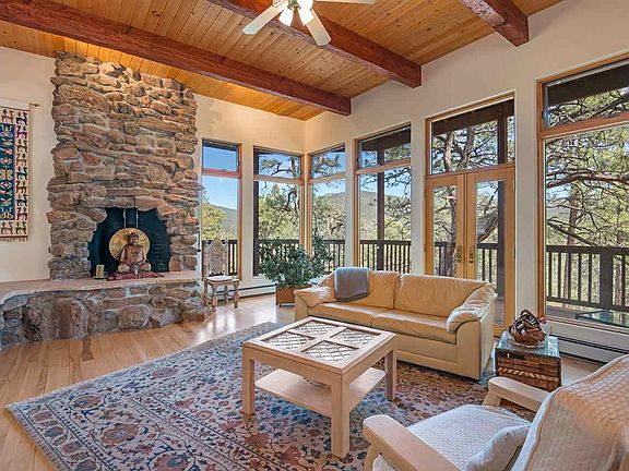 Pristine Mountain setting only 15 minutes to Kaune's Market Santa Fe! Enter the serenity of this warm and spacious home through an inviting foyer with handcrafted double doors. Living room with panoramic windows showcases majestic Ponderosa Pines outside, and master mason stone fireplace inside for cozy nights. Fall asleep to sounds of lush pines soughing in the wind! Redwood decks around main floor and spacious Master Bedroom Suite give easy access with sweeping mountain views. The first-floor, two bedroom guest suite with full bath is privately separate. Hickory wood floors throughout living room, informal dining area, kitchen with bar stool peninsula, formal dining room, and recently remodeled powder room. Hand-adzed beams on the ceilings of both floors add distinctive warmth to comfortable design flow. Kitchen with abundant storage has beveled-glass-front cabinets, a large pantry, and adjacent mudroom. Insulated 4 car garage, with skylights and space for a recreation vehicle, gives an extra 1000sf of level ground on hill terrain for your dream workshop! Many improvements and TLC by current homeowner of 13 years. Road has been greatly improved. Design Enginuity, a road engineering firm, was contracted in 2013. 18 new culverts were installed in 2014. Come see this light-filled, custom built home with its unique serenity, spacious living close to town, enjoyable privacy on 7.5 acres, and majestic beauty. Put on you sneakers and hike from your front door!