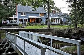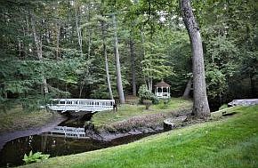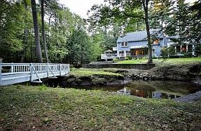 A private, SERENE and PARK LIKE SETTING and only 4 Mins.to schools, amenities and highways. Enjoy the view from the wrap around back deck off the living room, from the solarium or the screened porch. Extra Large Rooms and EACH BEDROOM has a private ENSUITE/Bathroom (Should you wish to have 4 Bedrooms this can be done economically). QUALITY mill work and detailing throughout including a fireplace in the vaulted FAMILY ROOM/Executive Den with Cherry Wood Built Ins and Wainscoting. The front-to- back Living Room adjoining the wrap around deck has a concealed built in OAK WET BAR / ENTERTAINMENT Center and fireplace. The finished lower level is ideal for a game room or gym and provides extensive storage space. Other amenities, updates and features: STANDBY AUTOMATIC whole house GENERATOR; HOT TUB; CEDAR closet in attic. Walk the trails or cross the gently flowing BOWMAN BROOK via the footbridge. See VIDEO. MAKE your MOVE! VISit today. Call or text Marianna VIS 603-860 8115