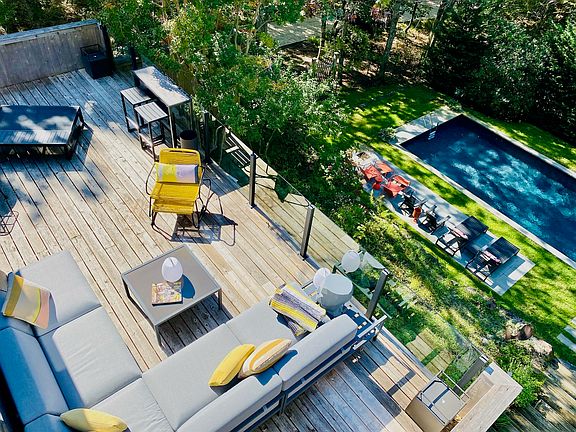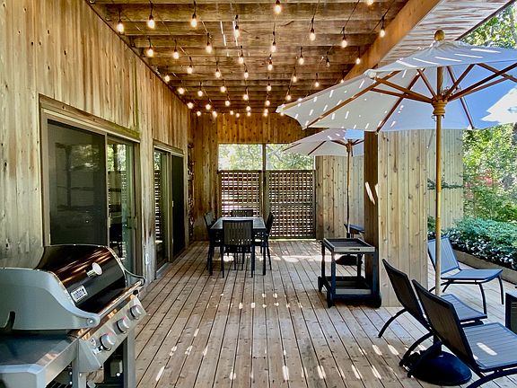 . The open floor plan first floor features heated concrete floors, mid-century style furnishings, large living room and dining room (separated by a double-sided fireplace), gourmet eat-in kitchen, beautiful half bath, large pantry/laundry room and through double sliding doors an oversized deck with outdoor dining for eight overlooking the pool. Second floor includes three bedrooms (queen bedroom with en-suite full bath and two other bedrooms (one queen, other two twins) sharing a new large full bath), high ceiling TV/game room and large double sliding doors leading to a furnished glass-railing deck overlooking the pool. Third floor loft features a primary bedroom (king) with en-suite new full bath and private glass-railing balcony overlooking the pool. Other features include heated pool, large outdoor shower, central air, two outdoor grills and a private setting.