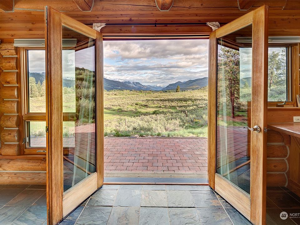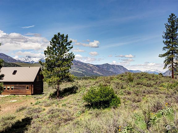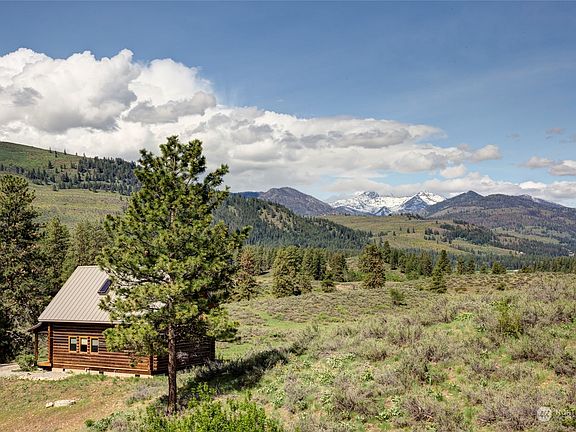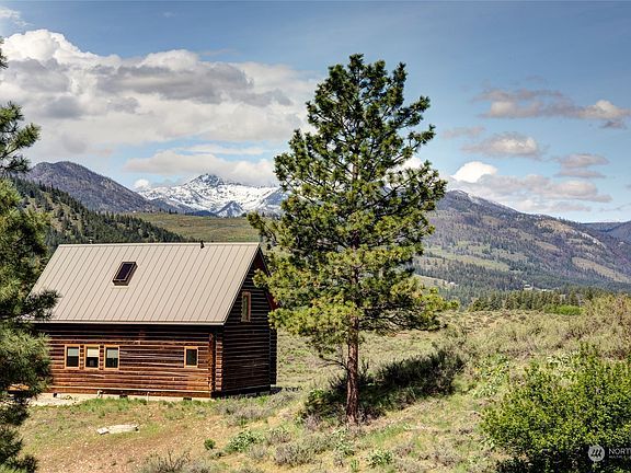 Spoiler Alert! This beautiful log cabin near town has wide open stunning views of Mt Gardner and the Mazama corridor. The cabin is sitting above and adjacent to Sunny M Ranch. Updated with concrete kitchen countertop, slate & wood floors, nice open layout, skylights, and newer roof, insulation, well line, well pump and hot water heater. Walk down your driveway to the ski trail across the road! It doesn't get better than this and you can't beat the location at the end of a dead-end road. 1bd, 1/2 bath and loft upstairs. The living room, kitchen, laundry and 3/4 bath are on the main floor. Lots of updated details. The lot is 3.37 acres and has been Firewise treated this spring. Community features pool, playground and clubhouse. Must see!