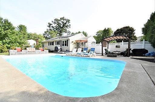 One level living with OPEN FLOOR PLAN and fantastic outdoor space with fenced grounds and INGROUND POOL with deck, patio and firepit! Enjoy spacious kitchen with painted cabinetry and stainless steel appliances open to bright dining area and entertainment size family room with wood burning fireplace and charming built-in bookcases, bright mudroom/sunroom, refurbished full bath, hardwood floors throughout, central air and ultimate rec room in finished lower level...the extra space is incredible! If you like to save money, then you will appreciate the solar panels that will provide you with energy savings for years to come! Convenient location close to highway access, commuter train and shopping. Don't let this one get away... *Highest and best offers due by Saturday 9/19 by 3pm.*