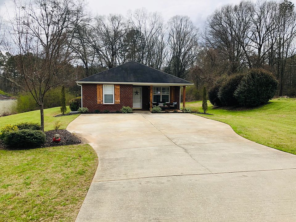 Welcome home! Beautifully renovated 4-sided brick ranch nestled in the city limits of Senoia. 3 bedrooms, 2 full baths with over 1,400 square feet of living space. Large open-concept family room and kitchen with granite counter tops and newly-renovated dining area. Pantry and laundry area conveniently located off of kitchen. Easy to maintain laminate flooring throughout the living space with carpet in the bedrooms. 260 square feet detached garage/ workshop with adjacent patio area that provides the perfect space for entertaining. New landscape and new cedar shutters/ columns. Located on a quiet, private drive ( no HOA) just walking distance and golf cart accessible to downtown Senoia. Showings by appointment only to prequalified buyers. Brokers protected.