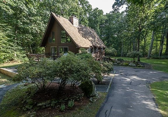 Welcome home to this charming A-Frame Contemporary home set on a 1.75 acre lot with soaring cathedral beamed ceilings! The 1st floor offers an open floor plan w/ two sliders to front deck great for outdoor entertaining, beautiful floor to ceiling masonry fireplace w/wood stove insert keeps the house toasty warm in those winter months, living room, dining room, kitchen with oak cabinetry w/cathedral ceiling, mudroom & pantry storage, spacious 1st flr main bedroom w/ slider to private back deck w/double closets, 2nd bedroom w/closet, & updated full bathroom w/tub. The 2nd floor offers a 3rd bedroom, loft area to use as an office or sitting area, 2nd full bathroom & closet storage. Lower level offers a 2nd wood burning fireplace, family room, bar area, walk-out to patio, laundry area with work area, 1 car garage under with additional storage. Newer oversized shed plus a woodshed, raised beds for gardening, level yard for lots of outdoor fun! A must see!!