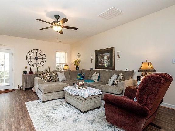 Spacious Ranch on large lot in peaceful cul de sac. Large master retreat w/tray ceiling, master bath w/tub/separate shower & walk in closet. Nice flowing kitchen w/ upgraded stainless appliances & breakfast area. Open concept dining room w/tray ceiling. Split bedroom plan w/ceiling fans in each.Screened 16X16 porch w/cable & remote ceiling fan, new 16 Seer Rheem HVAC w/10 yr warranty. Located close to medical, manufacturing jobs & excellent nearby schools. NO HOMEOWNER FEES. Beautiful home in a rural area