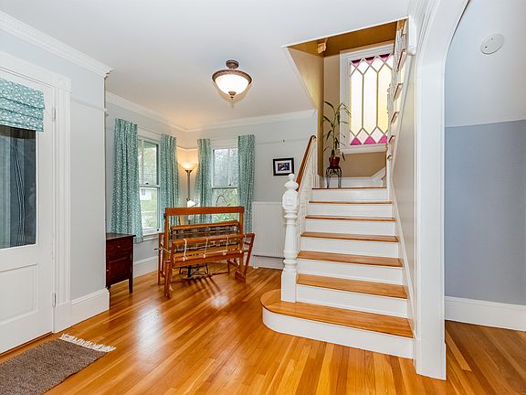 Picture Perfect Victorian New Englander is just brimming with charm & character. This gracious, sunfilled home has been tastefully updated retaining & adding classic appointments. From the moment you enter the foyer, you will fall in love. Gleaming hardwood floors, french doors, stained glass, curved archways with a welcoming flow that leads to all the space for living & entertaining. LR w/bay windows, classic dining room with pocket french doors & butlers pantry; efficient work kitchen spaces with custom cabinetry, quartz counters, undercabinet lighting, SS appliances, updated 1/2 bath & mudroom. The elegant staircase leads to the 2nd floor with gorgeous stained glass window at the landing & open to 2nd floor. Primary bedroom has vaulted ceiling & stained glass, 2 more bedrooms, 4th flex room could be exercise space, office or walk in closet for primary. The updated full bath has custom touches. The full basement houses the laundry area and bonus space for rec & workshop areas. Very well maintained including 3 yr old natural gas heating system & hot water & the roof is only 3 yrs old as well. The detached garage is perfect for vehicles & seasonal equipment. The back porch overlooks deep back yard for gardening & play & abuts the Community Trail. Location? Just perfect for walking to desirable downtown & shops, train station, elementary school & the list goes on. Enjoy your morning coffee from your farmers porch & contemplate your day. Welcome Home!