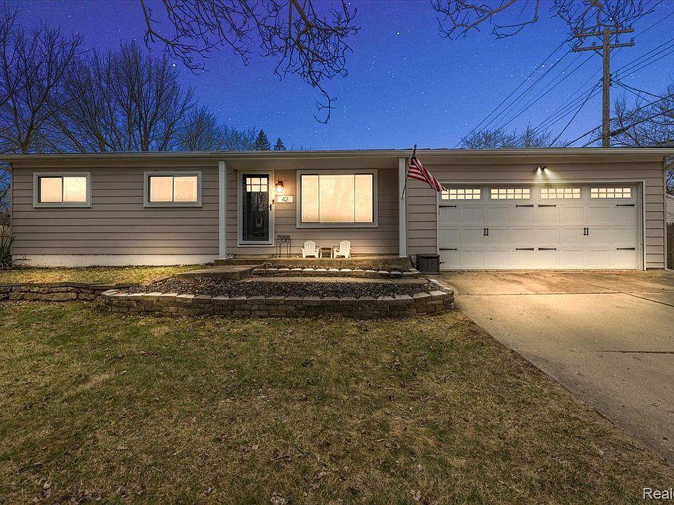 Enjoy Elizabeth Lake privileges with this charming 3-bedroom ranch, perfectly situated on a spacious double lot. Step into a bright living room featuring a large picture window that fills the space with natural light. The updated kitchen includes granite countertops, a stylish marble backsplash, stainless steel appliances, and a cozy breakfast nook with doors leading to the backyard patio. A full bathroom with unique vintage newspaper wallpaper adds character, while three comfortable bedrooms and a second full bath complete the main level. The attached two-car garage is currently set up as a "man cave," offering a versatile retreat. The basement provides additional living space, storage, and laundry, plus a flex room currently used as a dressing room. Outside, enjoy the covered patio, a large yard with a firepit, and a shed for extra storage. Elizabeth Lake access is available for a yearly fee, including boat slips and a beach. Updates include a painted exterior (2018), new metal roof and gutters (2023), furnace, A/C, and water heater (2018), awning (2021), and new doors and windows (2015).