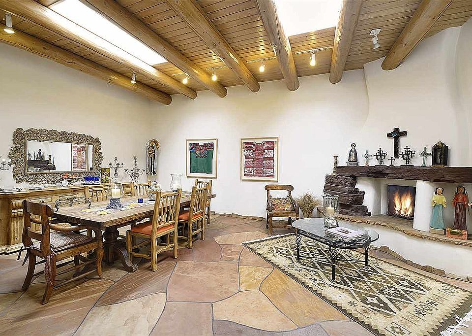 Fabulous adobe hacienda on 5 acres w/ pretty views in the SE foothills is superb pueblo revival style w/ gorgeous flagstone floors, 6 fireplaces, smooth plaster on thick adobe walls and beautiful viga ceilings w/ latillas of herring-bone cedar and split cedar, pine plank and smooth plaster. Wonderful living spaces include a formal dining room w/ sitting area and FP, very cozy family room w/FP, study/library w/FP and den/sun room. The master bedroom w/kiva FP and the study both open to a wonderful portal to enjoy our fantastic weather, great evenings and incredible sunsets. The portal is within a walled and beautifully landscaped garden courtyard. The master bath has antique wood and sombraje cabinetry and separate area w/tub, sauna and FP. The newly renovated kitchen has Wolf appliances, stone countertops, eat in area with french doors leading out to the garden and a portal with an outdoor kiva. A 2nd bedroom opens to the outside portal and adjoins a full bath with marble tiles. Amenities include a 2-car heated garage w/ skylights and large storage rm, new whole-house water conditioning, RO filtration in the kitchen, new state-of-the-art boiler for the radiant heating and domestic hot water systems, new foam roof, 32 new skylights throughout, new well pump and equipment and new irrigation system. There is an amazing huge professional art studio and very large storage area w/ shelving and utility sinks, a large laundry room with custom cabinets, a full bath, plus 2 lofts including a 3rd bedroom. IN addition to the house there is a separate custom designed artist studio designed by WAMO Studios. It is open and large with custom windows and clad in Delta Millwork Shou Sugi Ban. All only about 15 minutes from the historic Santa Fe Plaza, Canyon Road and the famed restaurants, galleries, museums and shops downtown.