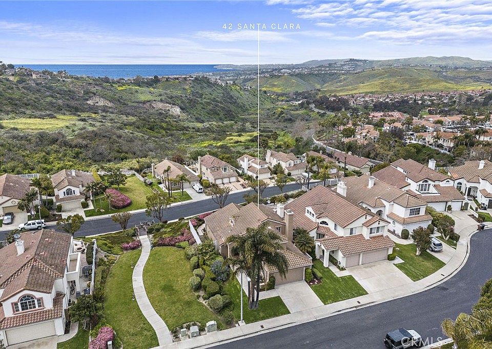 Nestled in the beautiful hills of Rancho San Clemente, this peaceful haven offers serenity unmatched. Located on a single-loaded cul-de-sac, the home is perfectly positioned to the west capturing amazing views framed by rolling hills and Catalina Island, direct sunsets on the horizon, and a clear view of the harbor inlet at the Dana headlands. Offering the most desirable floor plan in Pacific Shores, the downstairs ocean-view primary suite creates a single-level like living arrangement. The ocean-view primary offers high ceilings, a custom ADA tub, dual closets, dual sinks, private water closet, and walk-in shower. Upstairs, two generous bedrooms share a full bathroom equipped with dual sinks. One guest bedroom is quite oversized and the other features major views to the west with vaulted ceilings. All major living spaces including the formal living room & gas fireplace, powder bathroom, dedicated laundry room, galley kitchen (with options to open to the) ocean-view family and dining rooms are all conveniently located on the first level. Very light and bright throughout, high ceilings teamed with multiple windows allow for ample natural light to flood in. Several sliders doors create seamless indoor/outdoor living. Recently updated with new light & bright interior paint and all new carpet throughout, this home is the perfect canvas for a new owner to create their dream space and customize to their taste. Ideally positioned with a greenbelt to the south, the yard is very private with mature landscaping, a pergola, and ocean-view patios. Other values include underground utilities, expansive views from the first level and rear elevation of property, a 2-car garage with newly-painted floors, close proximity to San Clemente’s best beaches, 2.5 mile beach trail, and world-class surfing, walk to nearby schools and convenient shopping options, and just up the street from the new and popular Lifetime Fitness. Truly a great opportunity to own in one of San Clemente’s most peaceful, best-kept-secret enclaves in a primarily single-level floor plan with beautiful and preserved ocean views.