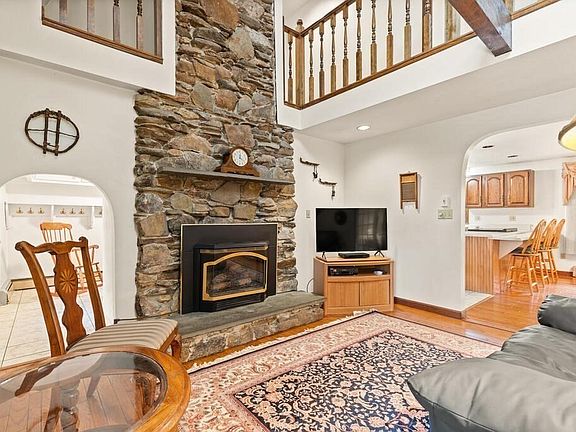 Experience serene living on this expansive 3+ acre lot, offering abundant privacy. This meticulously landscaped property sets the stage for a remarkable 4+ bedroom home, complete with a charming farmer's porch. The thoughtfully designed floor plan boasts a first-floor primary bedroom and bath, providing seamless access to the outdoors. Delight in the open country kitchen, featuring a spacious dining area and a family room adorned with a floor-to-ceiling fireplace, vaulted ceiling, and skylights. Adjacent to this inviting space, an enclosed porch awaits, allowing you to revel in the beauty of the surrounding nature. Lofted second floor, where you'll discover three additional bedrooms, a full bath, and a versatile finished bonus room above the garage. Enjoy the in-ground pool and take advantage of the barn, complete with stalls.