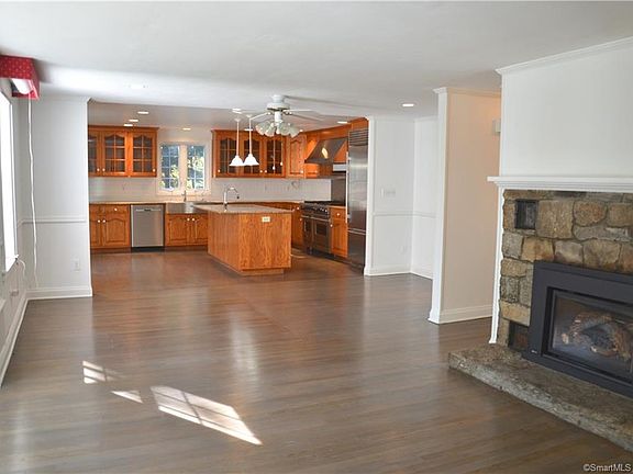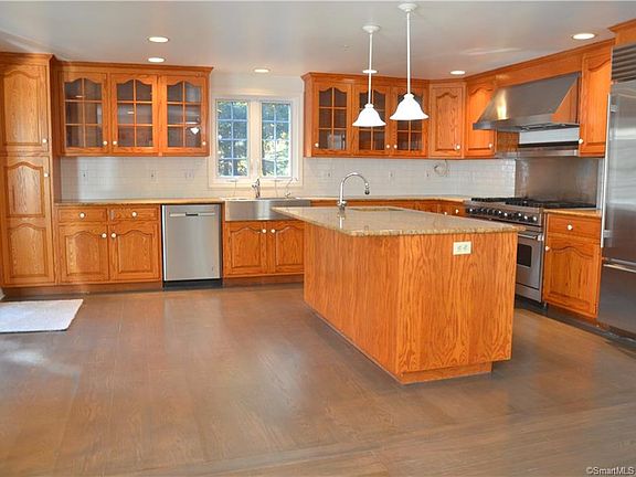 Expanded "Farmhouse" Colonial on level and private lot in convenient West Redding location (only a two minute drive or ten minute walk to the train station). Popular "open concept" living room/dining area, and over-sized "chef's" kitchen with island, oak cabinets and granite counters. Viking gas range; Sub-Zero refrigerator; Newer Maytag dishwasher. Sliders lead to 15.5'x 14' deck. Living room has gas log fireplace and bay window with custom window seats with storage. Hardwood floors in living room, dining area, and kitchen; Light filled family room with pellet stove, tile floor, wet bar, vaulted ceiling, 2 skylights, ceiling fan and door to patio; Den on first floor (Potential first floor laundry?); Full bath on first floor; Bedroom/"at-home" office on first floor; Master suite totals over 38' long and includes 17'3 x 13.9' sleeping area with private deck; dressing area with double closets (one of which is a walk-in closet); full bath; and a sitting room/den. Two additional bedrooms on second floor and a second full bath (with spa tub). Custom window quilts on many windows. Basement is partially finished (some pine paneling) with new carpeting and new basement windows. Newer carpeting on most of second floor;Attached garage was recently dry-walled and painted; House recently power washed. In ground pool with vinyl lining. Backyard and pool area fenced. Many mature plants add to the private backyard & pool. Home has two paved driveways. Whole house standby Generac generator