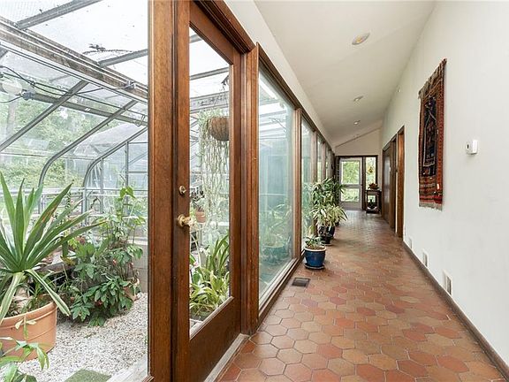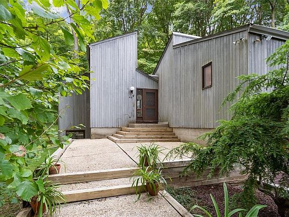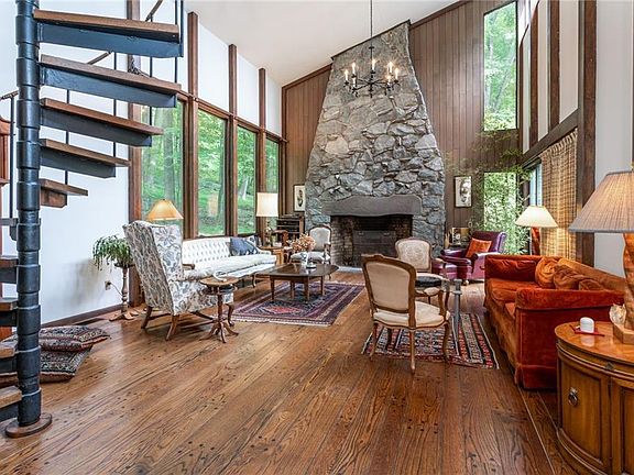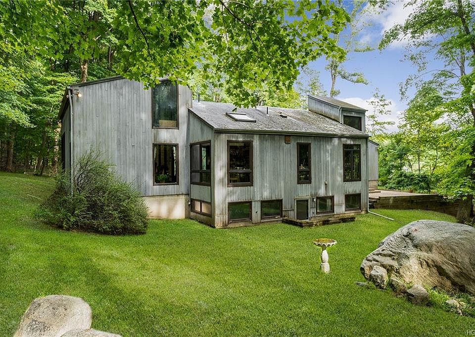 CONTEMPORARY STUNNER-Newly listed, this modern-style home in a cul-de-sac on 1.42 private acres backs pristine parkland and has many amenities that only a Contemporary can boast.The open-concept common area surrounded by windows offers a huge living room with 22 ft vaulted ceilings, an impressive stone fireplace, a dramatic circular staircase leading to a cozy loft hideaway, eat-in kitchen with indoor grill and big formal dining room all great for entertaining. A unique versatile floor plan includes 3.5 baths plus 5 bedrooms and 5 multi-purpose rooms some which could be bedrooms. Rooms with access to outside provide potential for home offices or extended family living. Don t miss the attached green-house which needs TLC but was awesome in its day. Enjoying the outdoors from a large patio with pond and fountain is extraordinary. Yet, there is an easy commute to NYC by bus, train+ all major highways. Near shops and services.Must be seen to be appreciated. Sold as is . Priced to sell.