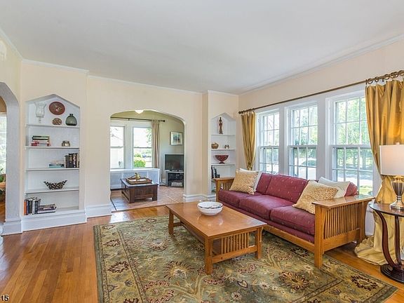 This light & bright tudor will win you over with its charm, updates & location! Arched doorways, leaded windows, hardwood floors are some of the features throughout. Spacious living room is adjacent to a comfortable den & formal dining room. Renovated E/I kitchen features custom wood cabinetry, ss app's, pantry & vaulted ceiling. New hall bath has double sinks & radiant heat. Fabulous fin/basement offers rec room, exercise & office space. 3rd floor recent makeover provides add'l square footage & is perfect 4th bedrm. Oversized deck leads to beautifully landscaped property & 2 car garage w/new doors. New furnace. BRAND new roof (house & garage). Ext painted in 2016! Ideally located --NY bus or jitney at corner, equally close to 2 train stations, 10 min walk to Brookdale Pk, 5 min walk to highly rated school.