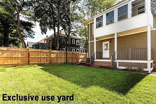 Spectacularly renovated 2-level condo with large private yard and plenty of parking! Yes - a large private yard and plenty of parking in East Arlington! This new condo conversion has all the bells and whistles you'd expect from a wholesale remodeling: open floorplan, gorgeous sleek kitchen with tons of cabinets and counter-space, central air, and updated systems. The main level has an open concept living room/dining room/kitchen, plus 2 bedrooms, office, and full bath. There's a 3-season back porch and front porch off the office. 3rd floor master suite has dramatic ceiling angles with a skylight, window seat, walk-in closet, huge bath with double sink, and laundry room. The fenced-in yard is accessible from the back stairs which go directly to the exclusive use back porch. In addition to the deeded garage and driveway spaces, this corner lot is on a private way allowing for additional overnight parking. Pet friendly. Come see!