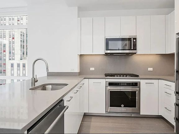 Spectacular views from this 38th floor corner one bedroom. Enjoy a king sized bedroom in the center of Manhattan. This true home is sundrenched and boasts 10 ft. high ceilings, floor to ceiling windows, a chef's kitchen with built in pantry, stainless steel European appliance, an extra- large breakfast bar to entertain 4 guest, an in-unit washer/dryer.