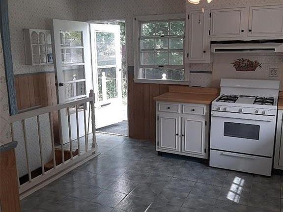 Lets look at the positives of this house. Taxes are just over 200 a month. The basement was finished at one time and with very little work can be finished again with very little work. In the basement there was a 3rd bedroom, wood burning stove, laundry room, and a bar. There is a walkout to the deck from the kitchen. This is very nice when grilling on the deck. There's hardwood floors through out. The roof is brand new and the furnace recently installed. This is also a very nice street a couple of blocks from the college and 10 min walk to NYC bus. OK, Yes, there is a lot of wallpaper. It comes off or you can skim coat over it.
