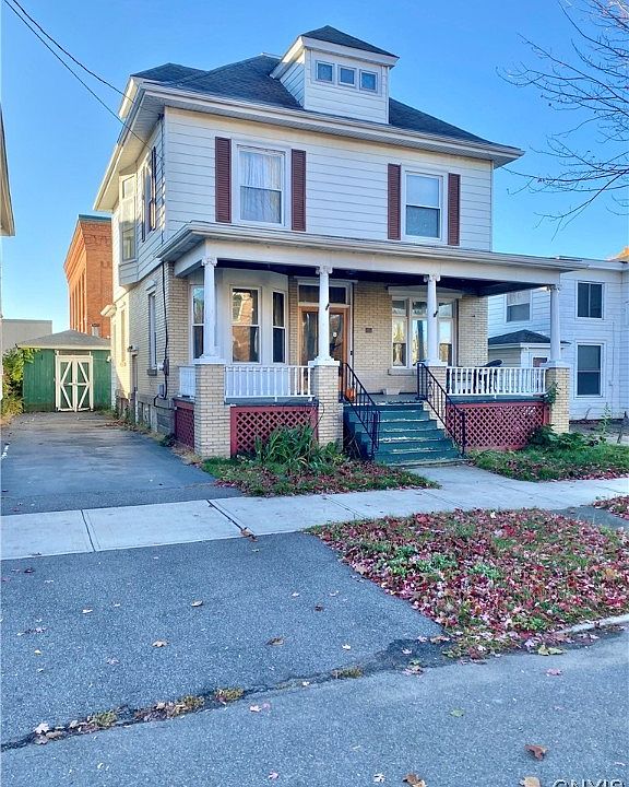 Charming three bedroom American Foursquare combines classic charm with modern convenience. This home features hardwood floors, decorative woodwork, tall ceilings, and a stunning wood staircase. The main floor offers a large foyer, formal dining room and living room seperated by french doors. Enclosed back porch leads to a partially fenced yard, complete with a shed for tools and a workshop for hobbies. Walk-up attic provides excellent storage or potential for additional living space. Full finished basement with side entrance offers plenty of room for entertaining, featuring a custom-built full size bar. Half bath and laundry room is also located in this lower level. Detached garage has been converted into a spacious workshop. This home is located in a quiet neighborhood within walking distance to downtown Oswego and offers plenty of off-street parking.