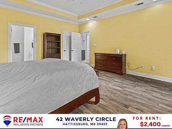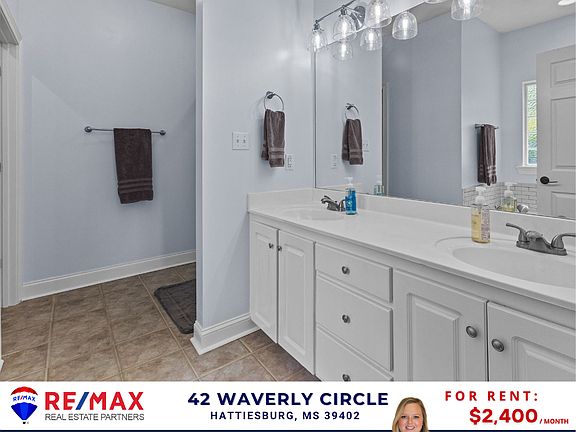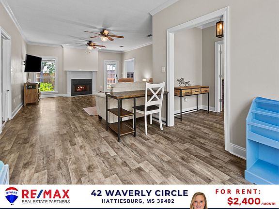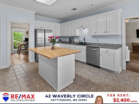 Welcome to 42 Waverly Circle an updated, well-appointed home in The Trace subdivision in Oak Grove. This 3-bedroom, 2-bath split-plan sits on an oversized lot and offers both elegance and comfort with premium finishes and generous indoor and outdoor living spaces. Inside, you'll find an open-concept layout with 10-foot ceilings, hardwood flooring, and a spacious great room centered around a gas-log fireplace. The kitchen features granite countertops, a butcher-block island, stainless steel appliances, and ample cabinet space, making it ideal for daily cooking or entertaining. The formal dining room and breakfast nook offer flexibility for hosting or relaxing. The master suite includes a double vanity, separate soaking tub and shower, walk-in closet, and dedicated sitting area. Additional highlights include a bonus room ideal for an office or playroom, a dedicated laundry room with washer and dryer included, and a 2-car garage with a storage room. Step outside to enjoy the covered front porch, back deck, and a fenced-in backyard perfect for pets or outdoor gatherings. Located in the Oak Grove School District, minutes from shopping, fitness centers, and walking trails. Lawn care and pest control are tenant responsibilities. Pets welcome with approval (non-refundable pet fee + monthly pet rent). Available for move-in starting June 6, 2025. Tenant pays all utilities and maintains lawn and pest control services. Utilities & Services: Water: Arnold Line Water Association, Electric: Pearl River Valley Electric, Gas: Spire Natural Gas, Sewer: Community septic or private systems, Trash Service: (Included) Lamar County Solid Waste Division