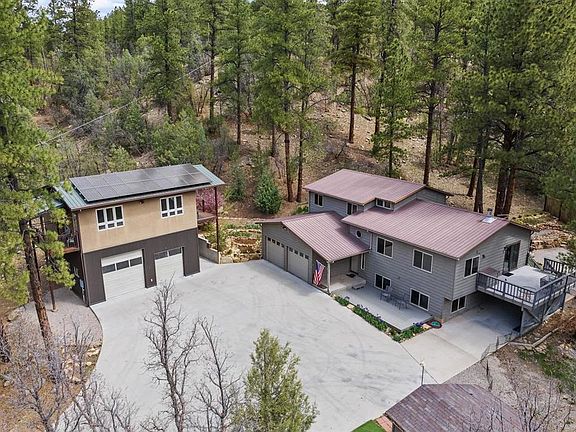 This spacious three bedroom home combines comfort, practicality and modern living in a secluded setting only three miles from downtown. This home features three bedroom two 1/2 bath, den/flex space, a two-car attached garage with ample storage and an additional heated oversized two-car detached garage fireproofed with a 30-amp hookup, with a workshop. Above the detached garage is a stunning 728 square foot office/ artist studio. Trek deck with outdoor speakers. The property is situated on three secluded acres in a private four home development with no HOA fees. It offers the perfect place to park your RV, boat, and other recreational vehicles. the large driveway has just been repaved and triple sealed. The newly fenced and landscaped yard includes a rock wall with Trex deck that has steel framing and perforated steel stairs, perfect for entertaining guests throughout the year. Both the home and office run on solar power, and the main house includes in-floor heating, on-demand hot water heater, reverse osmosis for drinking and helmet guard on the gutters. Don't miss out on this beautifully well maintained home that is only three miles from downtown!
