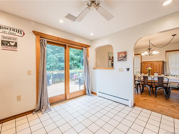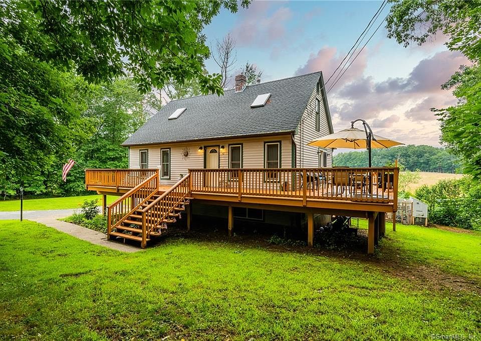 Welcome to 42 Woodcrest Dr, the perfect balance of accessibility & privacy! This 3 (potentially 4) bedroom 1 bath cape has so much to offer. As you walk up the stairs to the wrap-around deck, the front door leads into what is currently the dining room, but could also function as a great living room space. Wide board hardwoods & exposed brick give this room a cozy rustic feel. A pass through & wide entryway open into the bright eat-in kitchen with tiled floor, new appliances, & a slider to the deck, perfect for outdoor gatherings & meals. The hardwoods continue down the hallway which leads to a full bath, bedroom, & current living room (which could function as the 4th bedroom, already with a closet in place). Upstairs leads to 2 additional generously sized bedrooms, both with wide board hardwoods & skylights providing plenty of natural sunlight. To top it all off, the basement is partially finished with tiled floor, a wood stove, & a walk-out to the backyard. The basement also connects to the attached garage for parking or extra storage. Additional features include a newer roof, hot water heater, well pump, carpeting, upgraded electrical panel, and even a chicken coop & run in the backyard. Conveniently located off of Route 12, within close proximity to restaurants, shopping, downtown Jewett City, I-395, and more! Enjoy the 3D Tour link here: rem.ax/42WoodcrestDr & see all that this amazing property has to offer!